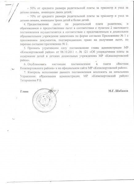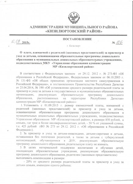 Постановление Администрации МР Кизилюртовский район О плате, взимаемой с родителей за присмотр и уход за детьми ДОУ